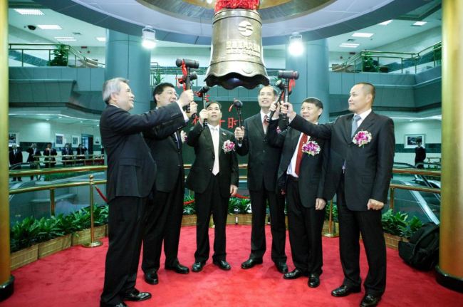 2010年12月15日,天舟文化董事长肖志鸿(右二)在深交所敲钟庆祝公司上市