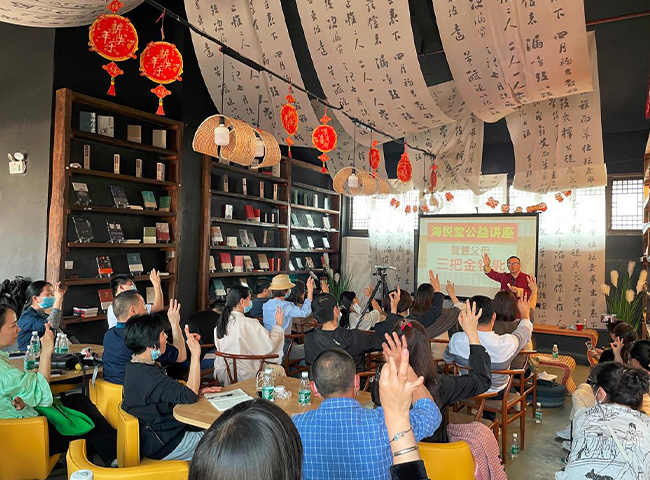 阳春三月,春风扑面。3月13日下午,为宣传贯彻《家庭教育促进法》精神,天舟文化在长沙市铜官窑草市海阅堂举办主题为“让孩子成长的三把金钥匙”的家庭教育智慧营公益讲座。本次活动由荣耀体育在线主办,海阅堂承办,特别邀请六和先生作为本期的主讲导师。40余名学员到场参加了本次活动。